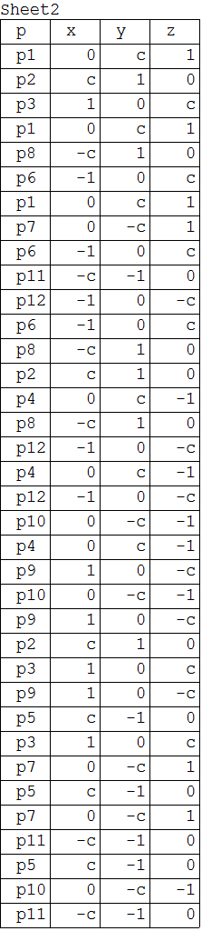 。チェックが済んだら、各点の、x-y-z 座標を、Sheet1 の通りになるように、入れて、表を完成させます。この